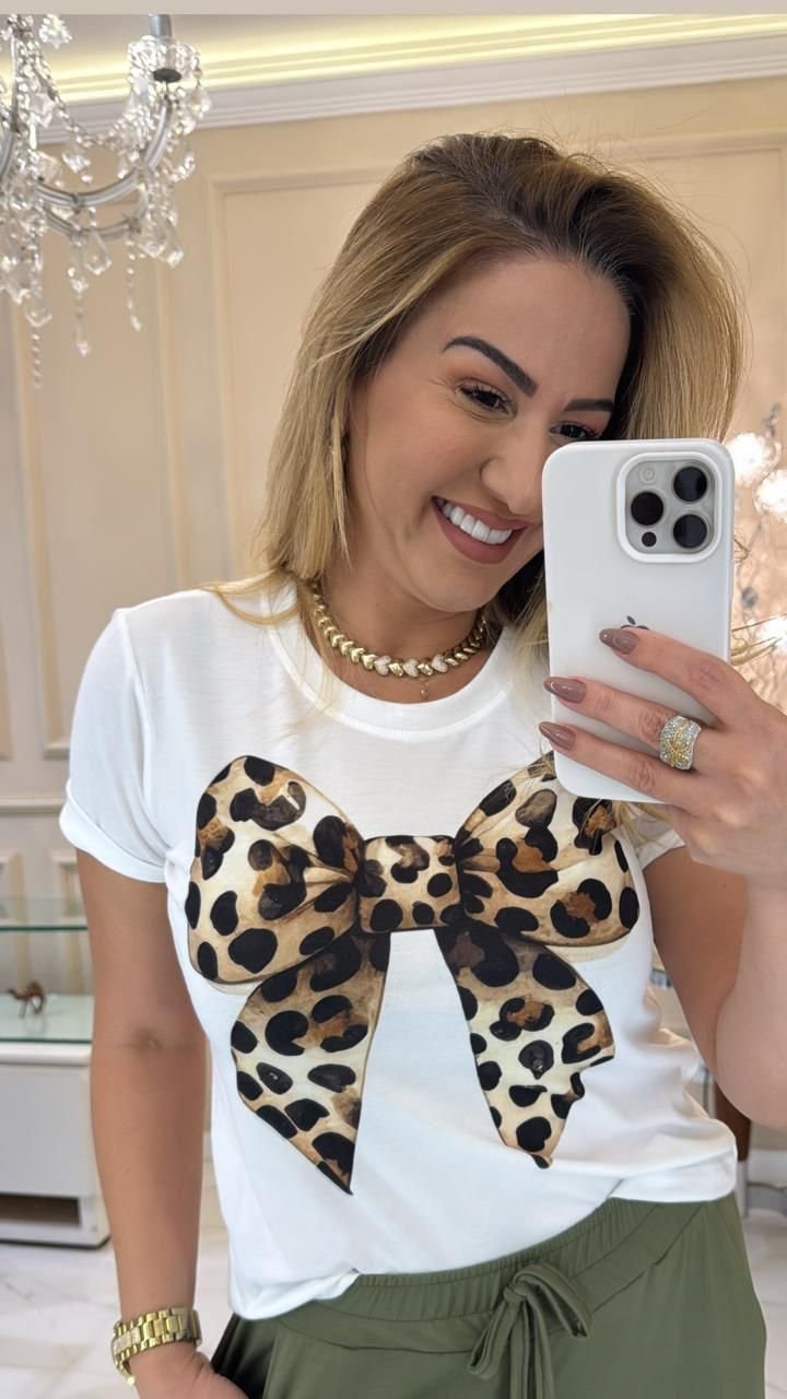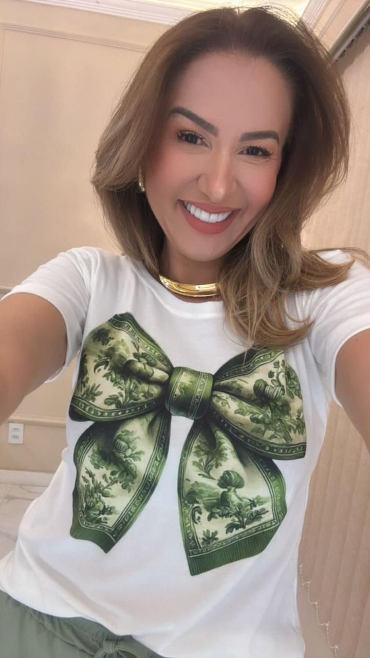 Uma peça charmosa e versátil, a t-shirt off é confeccionada em malha macia e confortável, ideal para o dia a dia. O destaque fica por conta da estampa central de grande laço, que traz um toque feminino e sofisticado ao visual.